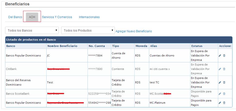 ¿Por qué mis beneficiarios no se muestran en las opciones de Transacciones?Por motivos de seguridad y atendiendo a políticas del Banco, las inclusiones de nuevos beneficiarios son manejadas como solicitudes que requieren ser validadas por su oficial de cuenta para confirmar que usted es quien ha realizado la solicitud. Es importante que revise la opción Mis Mensajes, o consultar la opción de Beneficiarios en cuya lista se muestra una columna que indica si su beneficiario está Disponible para Pagos.
